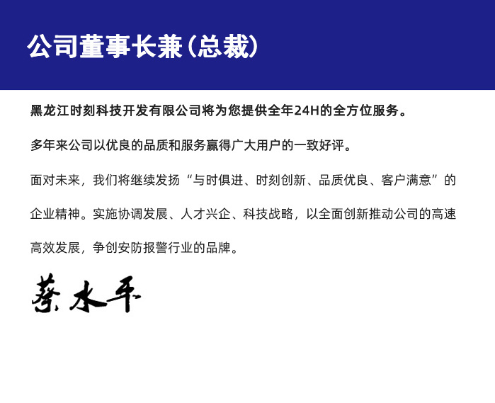 黑龙江时刻科技开发有限公司将为您提供全年24H的全方位服务。多年来公司以优良的品质和服务赢得广大用户的一致好评。面对未来,我们将继续发扬“与时俱进、时刻创新、品质优良、客户满意”的企业精神。实施协调发展、人才兴企、科技战略,以全面创新推动公司的高速高效发展,争创安防报警行业的品牌。